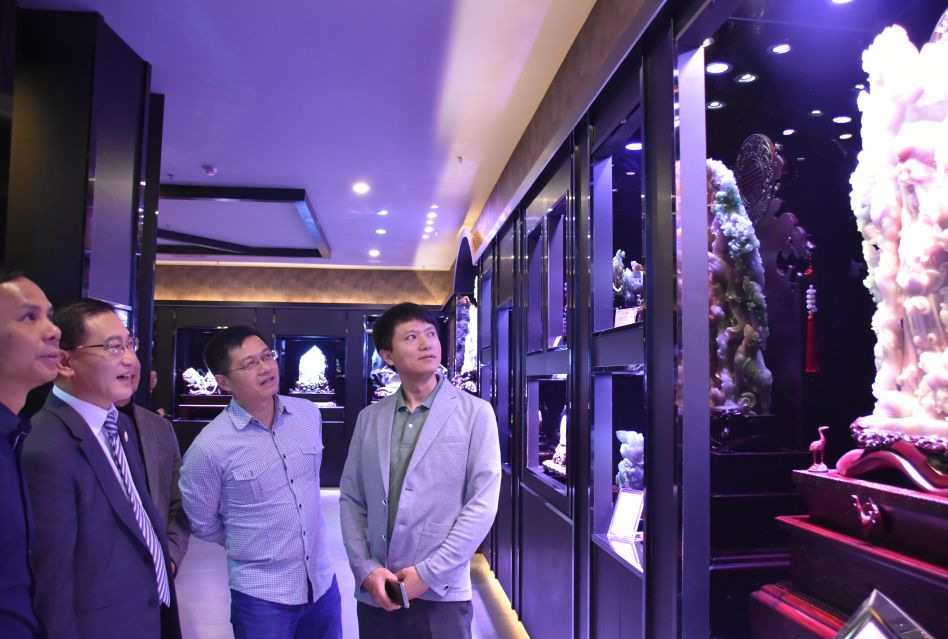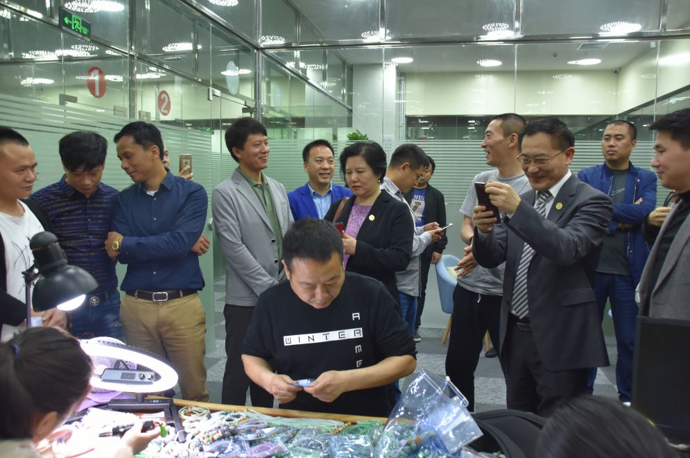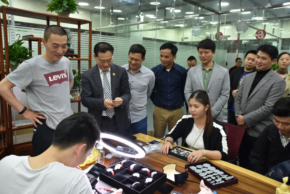 在臧總的陪同下,中寶協(xié)領(lǐng)導(dǎo)一行參觀了玉博城一層、二層、三層的翡翠市場,興致勃勃地參觀了商城內(nèi)掛飾、擺件等琳瑯滿目、種類繁多的翡翠精品。電商直播作為翡翠行業(yè)新興的營銷方式頗受商家青睞。畢立君秘書長還特意參觀了商城二層電商直播區(qū),并與電商商戶親切交談,詳細(xì)了解當(dāng)前電商的發(fā)展現(xiàn)狀及未來運營思路。