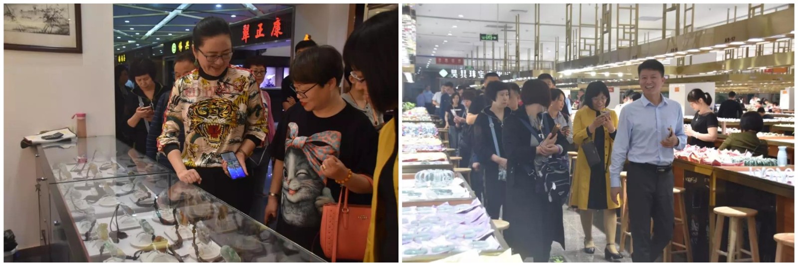 粵港澳之旅的第一站,觀光考察團一行人來到四會玉博城。玉博城是太和集團旗下的第六大商場,于2019年3月9日隆重開業(yè)??傆?7萬平米體量,吸納8000多家實力玉商入駐。從成品掛件、精美手鐲到精品擺件,四會玉博城精美翡翠飾品和絡(luò)繹不絕、穿梭如織的人流,讓考察團留下了深刻的印象。玉博城不僅有全品類精品翡翠,而且規(guī)模之宏大、硬件之全和極具性價比的翡翠制品都讓考察團贊嘆不已。