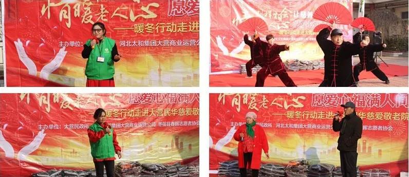 讓慈善情系天下,愿愛心福滿人間。2019年12月20日上午,由河北太和集團大營商業(yè)運營公司、大營鎮(zhèn)民政所、棗強縣春暉志愿者協(xié)會聯(lián)合舉辦的暖冬公益演出活動在大營民華慈愛敬老院成功舉辦。此次活動,大營商業(yè)運營公司為敬老院的老人們捐贈了價值3000余元的生日蛋糕、羽絨馬甲等生活物資;來自中國·大營國際裘皮城的愛心商家也捐獻了價值200余元的棉襪,交由大營商業(yè)運營公司代送給老人們。