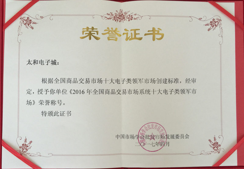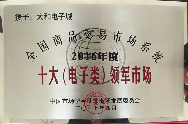 太和電子城榮獲 2016年全國商品交易市場系統(tǒng)十大電子類領(lǐng)軍市場